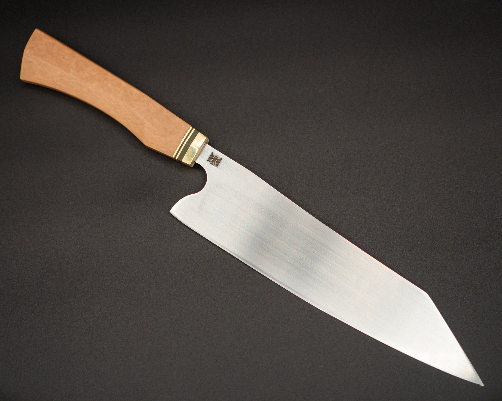 This 9" K-Tip Chef knife is crafted from 1095 steel with an S-grind, providing a blend of sharpness and durability. The blade features a hand-sanded satin finish, offering a sleek, professional look. The handle is a striking combination of Maple Valley Richlite, OD G10, and brass, ensuring a comfortable and secure grip while adding a touch of elegance to the design.