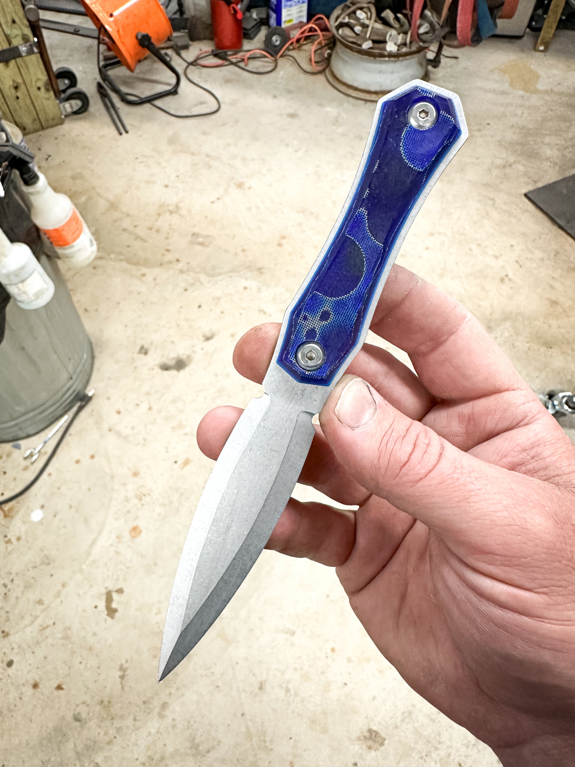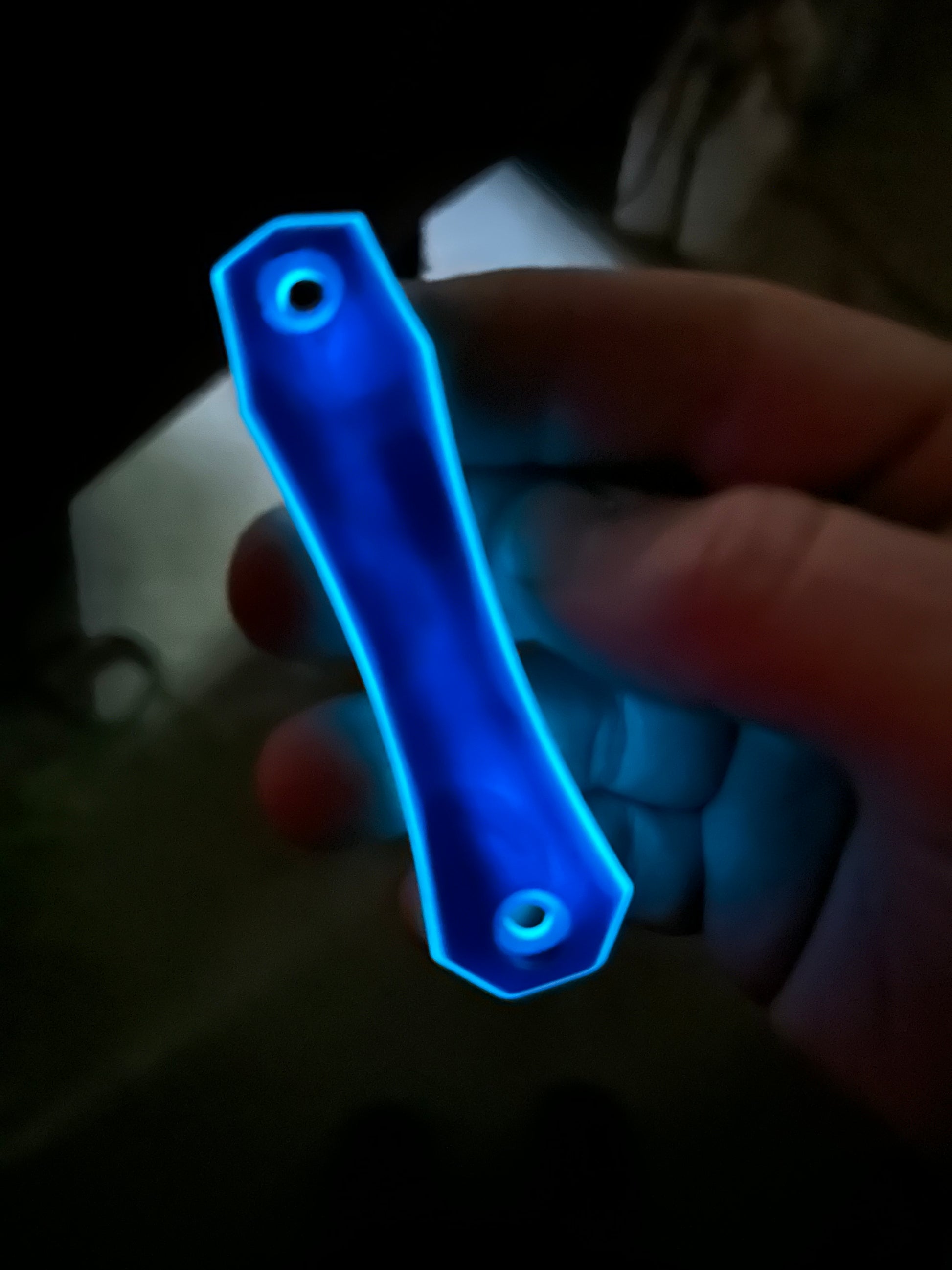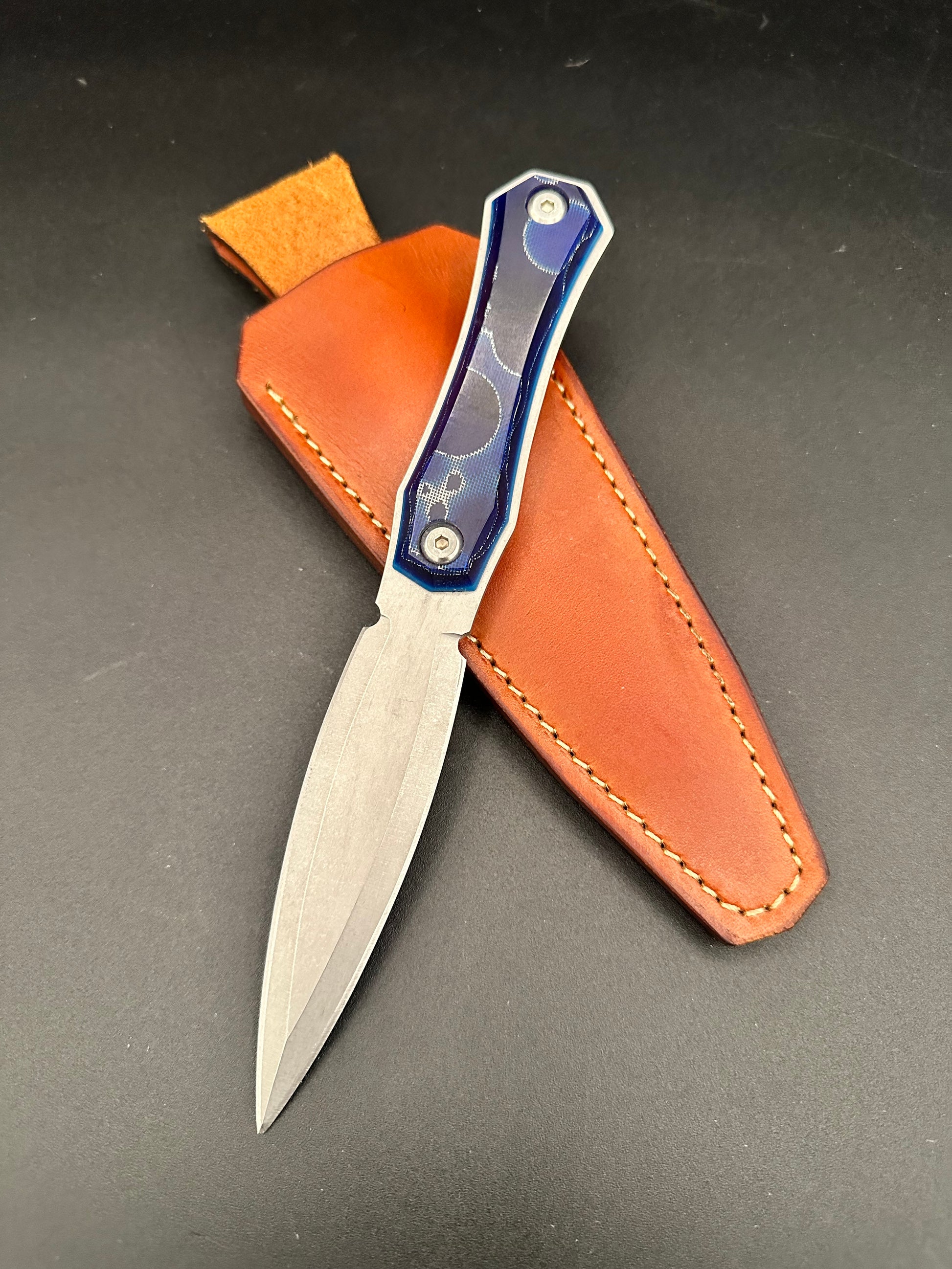 Crafted from Nitro-V stainless and finished in a crisp silver stonewash, the full-size Drifter brings refined aggression to the table. Its handle features striking Raffir resin composite scales with embedded stainless mesh, set over a glowing blue liner from Skur Composites. Sleek, modern, and unapologetically bold — this is the Drifter at full force. 8” OAL 4” Blade & Handle